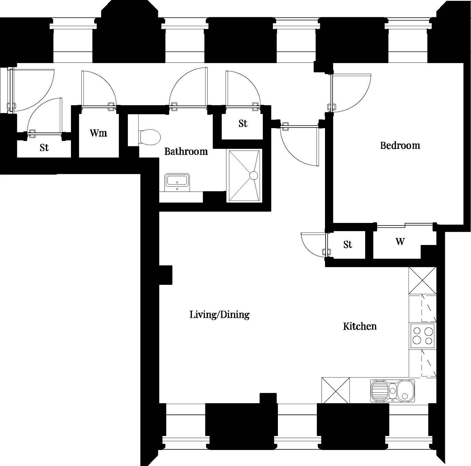 The Eagle combines style with practicality, designed for modern city living. A light-filled hallway leads to all rooms, including a sleek bathroom, a well-proportioned main bedroom with built-in wardrobe, and a generous open-plan lounge, kitchen, and dining area. Multiple storage cupboards ensure the apartment is as functional as it is comfortable, making it an ideal choice for contemporary urban life.